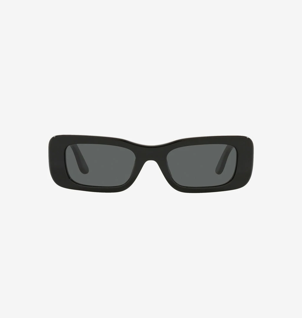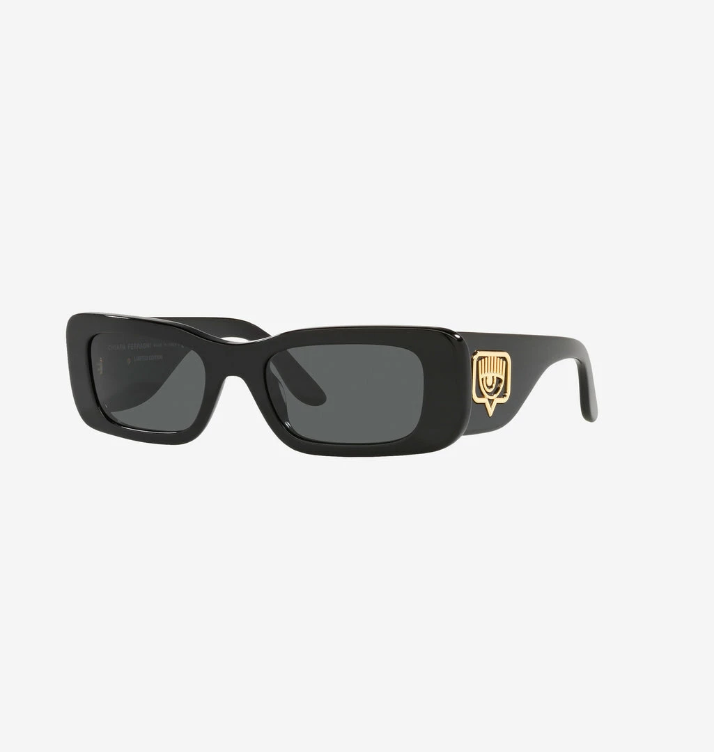 Black frame rectangular sunglasses, with soft and rounded profiles. Black lenses and gold Eyelike detail on both temples