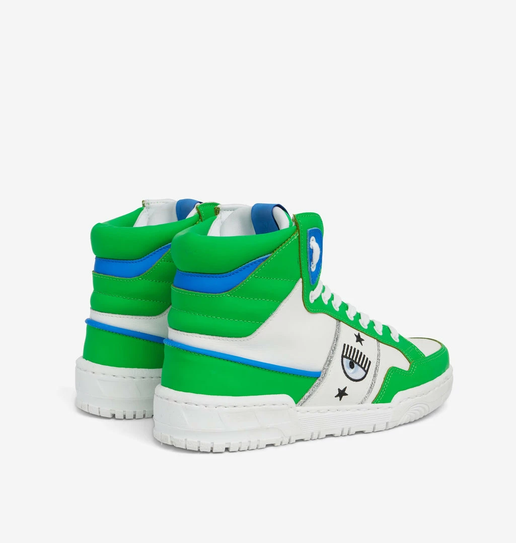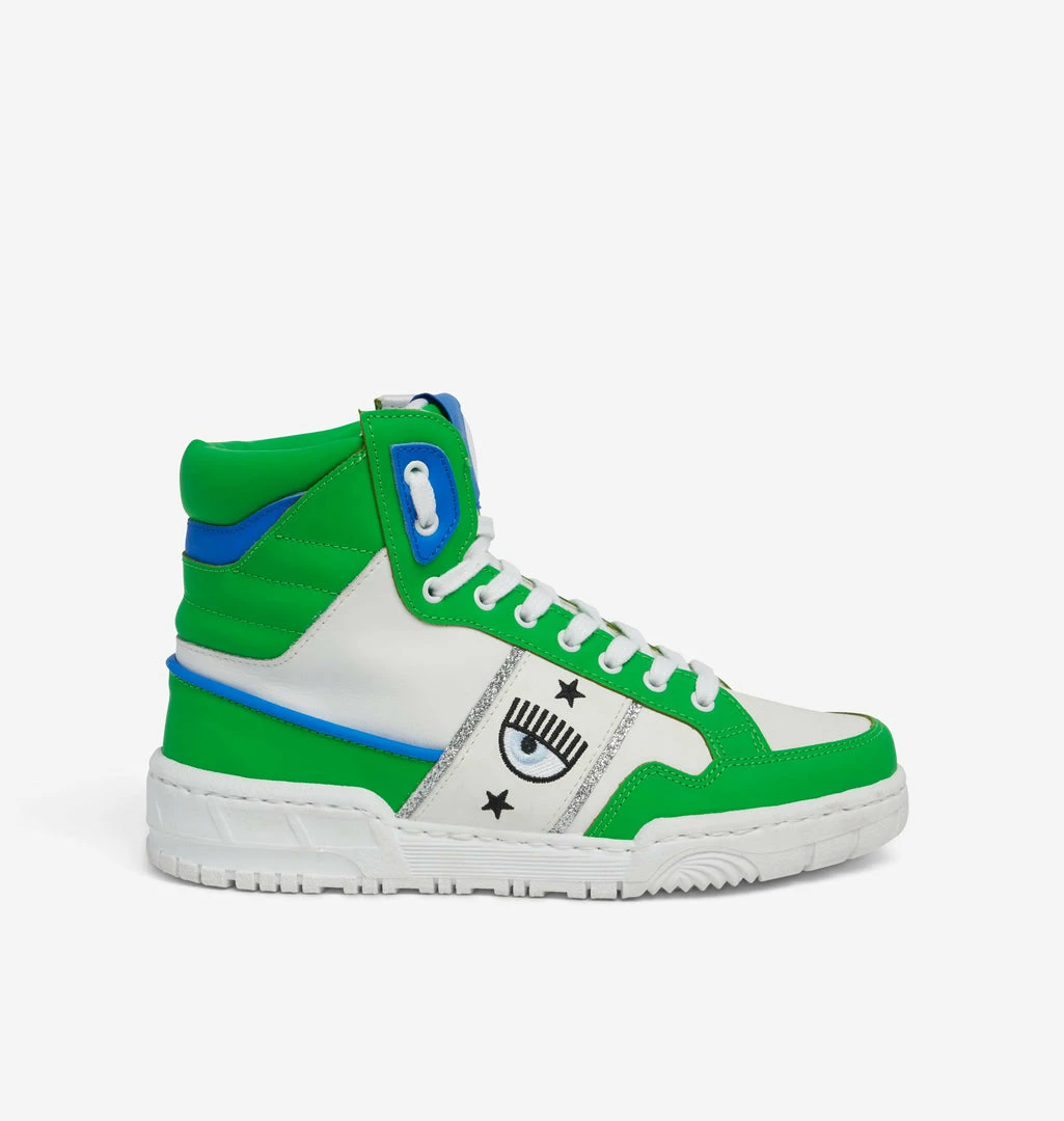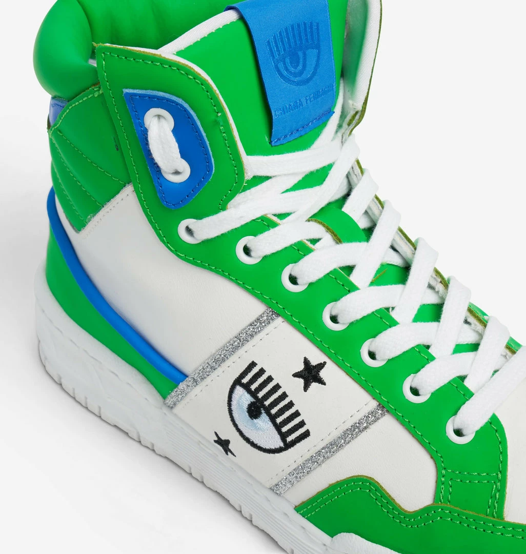 High top CF1 sneakers in neon green leather. Logomania band on the sides. Rubber sole. Tone on tone green laces. Made in Italy.