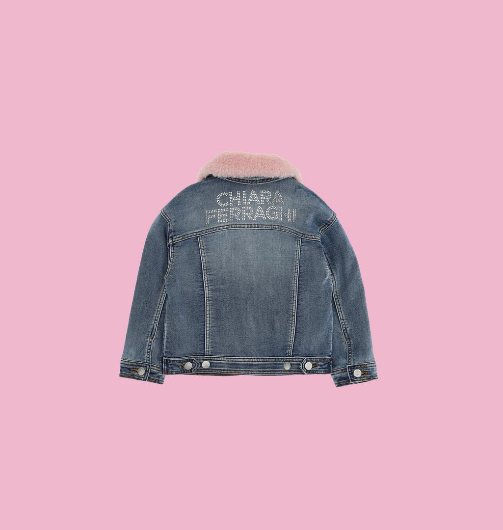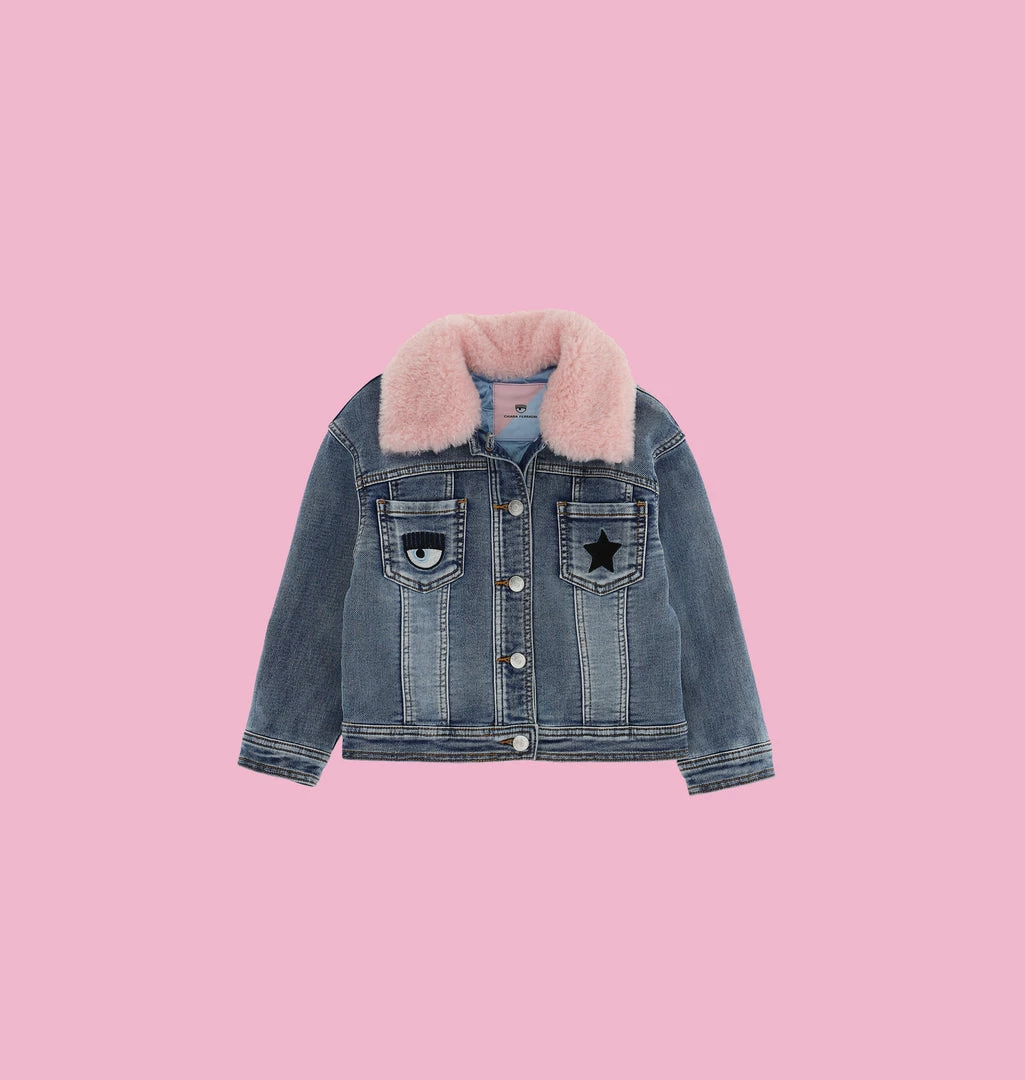 Denim jacket with pink faux-fur collar and Eye Star. Chiara Ferragni glitter lettering on the back.