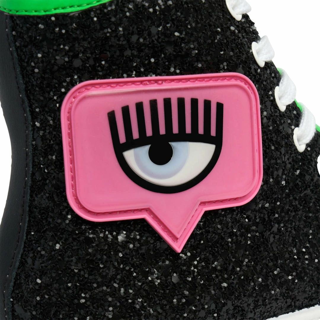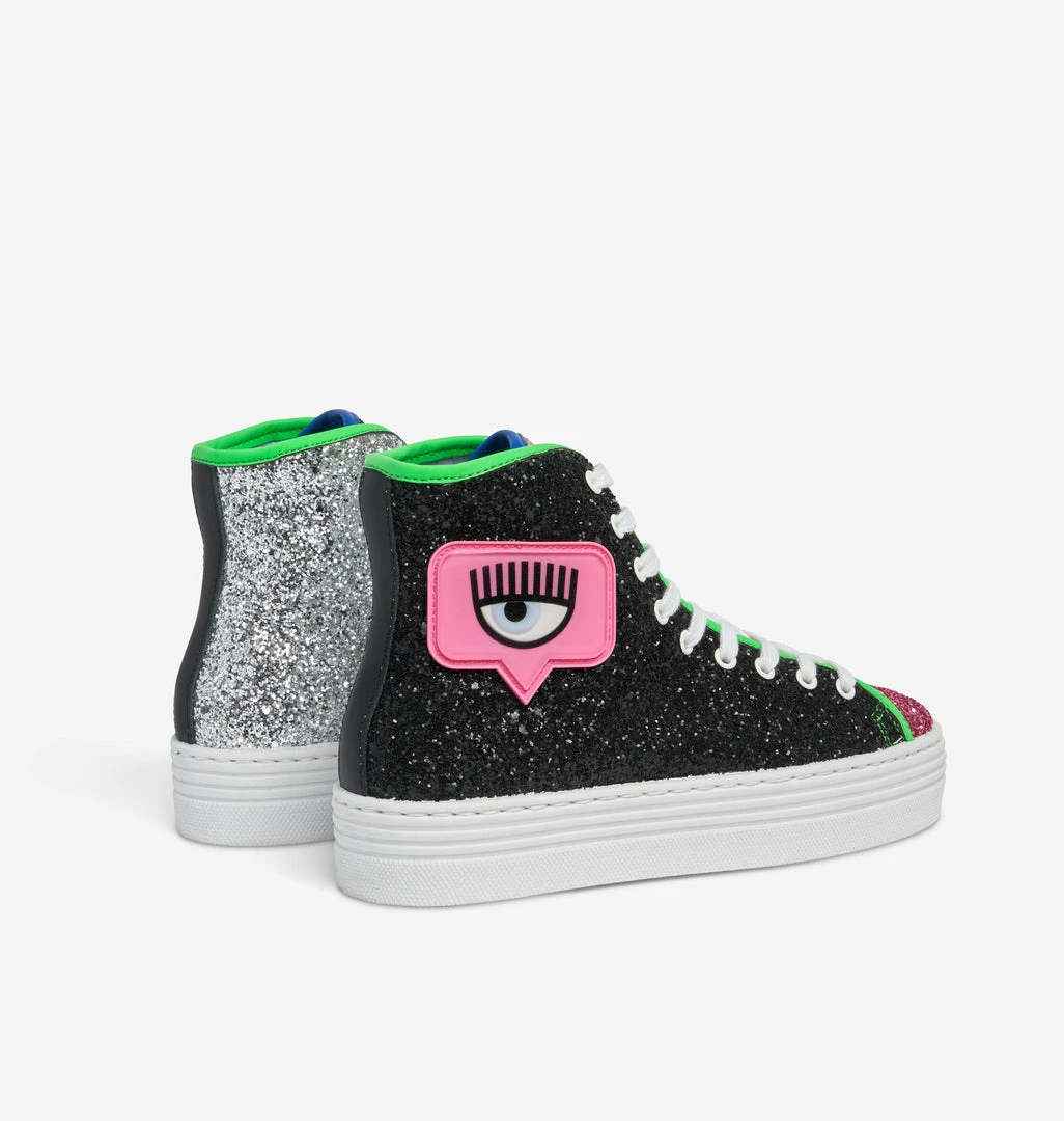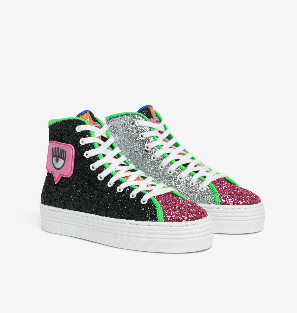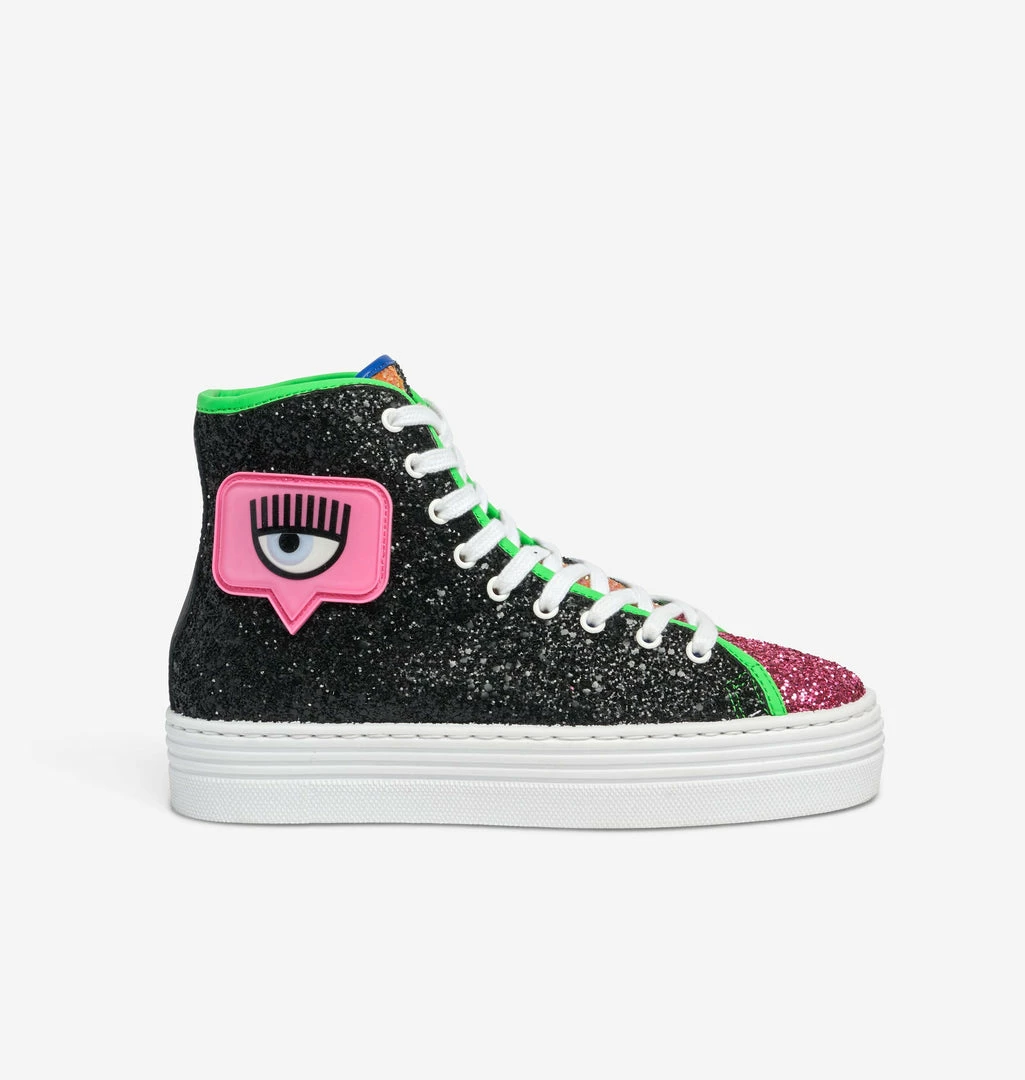 Eyelike high sneakers in multicolor glitter with 35 mm white sole. Eyelike silicone patch on the sides and Chiara Ferragni silicone patch on the tongue. Made in Italy.