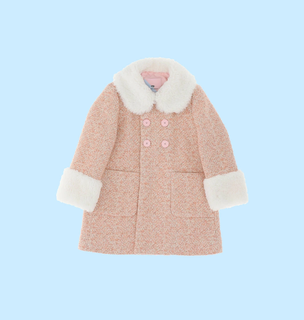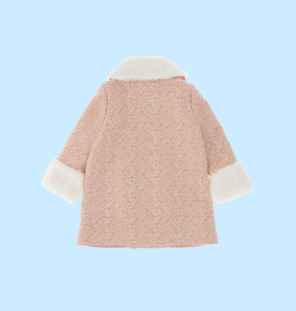 Pink baggy coat in twill, with faux-fur collar and cuffs, buttons.