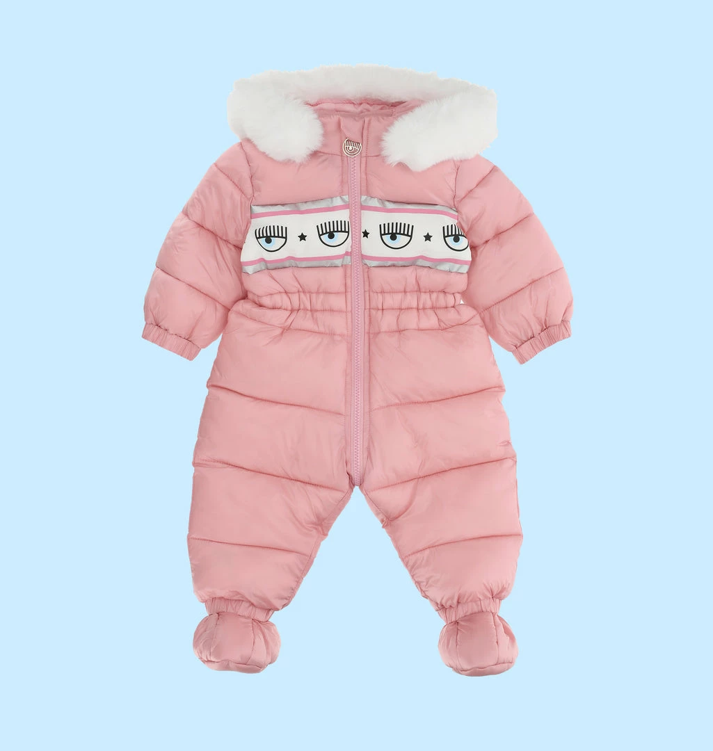 Pink puffer playsuit with Maxi Logomania band and eco fur collar.