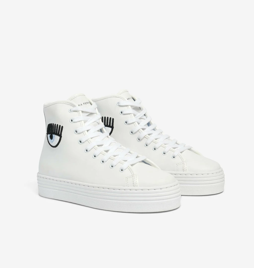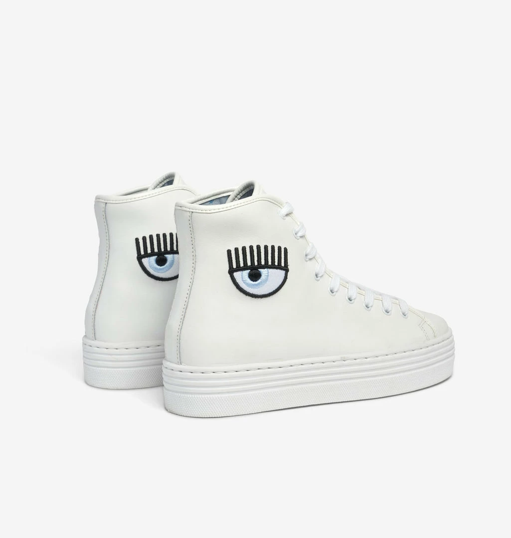 Eyeheart high sneakers in white leather with 35 mm white sole. Eyeheart embroidery on the sides. White tone-on-tone laces. Made in Italy.