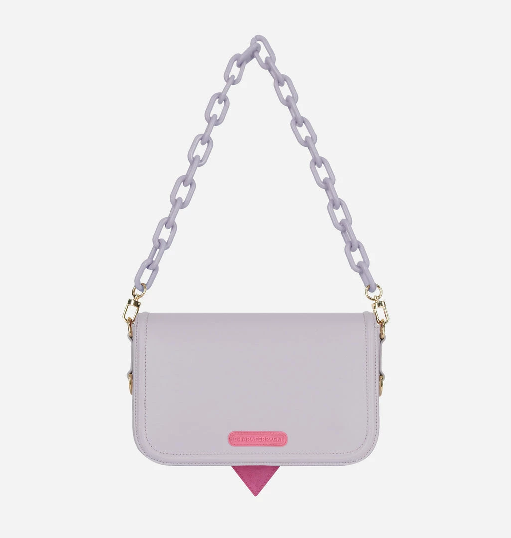 Eyelike Big Bag in synthetic fabric. Lilac color. Magnetic closure. Front logo. Chain shoulder strap in golden metal. Additional tone-on-tone shoulder strap. Width: 25 cm, height: 21 cm, depth: 5.5 cm