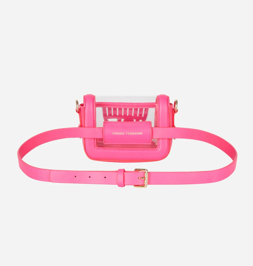 Eyelike mini bag with synthetic fabric belt. Fuchsia color. Magnetic closure. Front logo. Adjustable tone-on-tone belt and chain shoulder strap in golden metal. Width: 15 cm, height: 10 cm, depth: 4 cm.