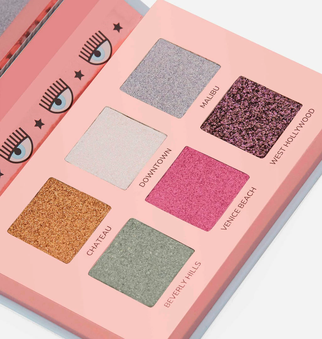 Los Angeles is the eye palette made up of 6 shades of super versatile cool and vibrant eye shadows. This palette features highly pigmented formulas and contains matte, shimmer, metallic and glitter colors, perfect for expressing yourself in any situation. Each shade bears its name of the places in the city of Los Angeles that Chiara considers her “favorite places”.