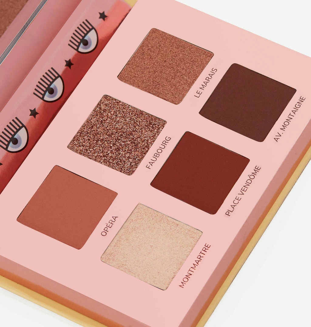 Paris is the eye palette made up of 6 shades of super versatile brown nudes. This palette features highly pigmented formulas and contains matte, shimmer, metallic and glitter colors, perfect for expressing yourself at best in every situation. Each shade bears the name of the places of the city of Paris that Chiara considers her “places of the heart”.