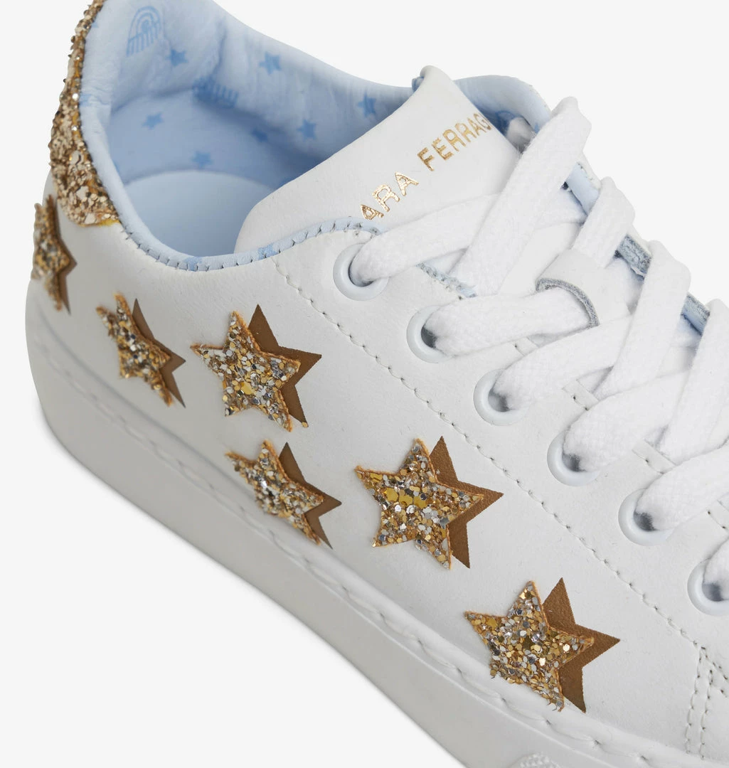 Roger sneakers in white leather with gold glitter stars details. Chiara Ferragni logo on the tongue. Light blue leather lining and insole. Made in Italy.